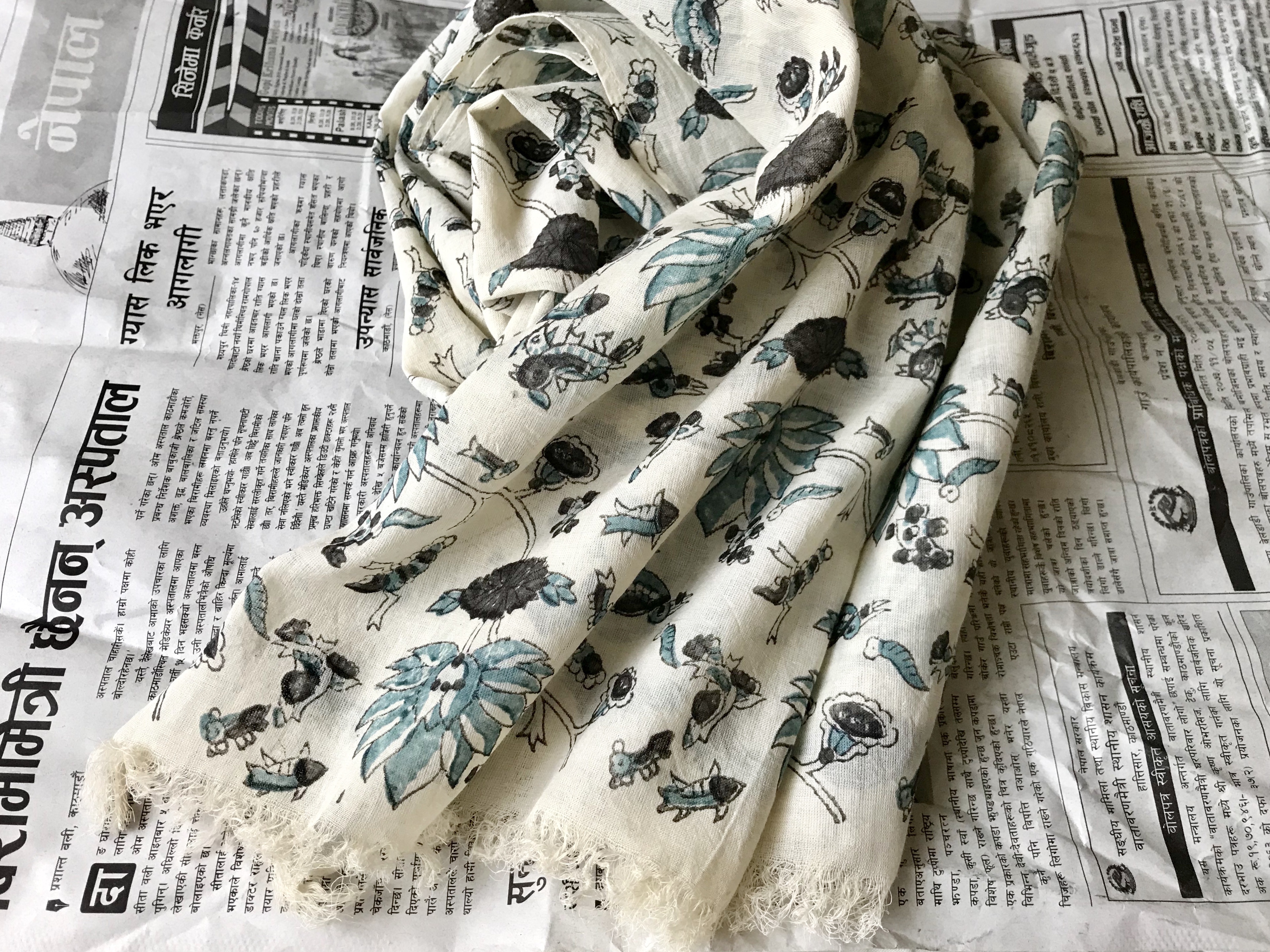(オーガニックコットンショール) 蓮模様の手織りショール、ひと柄ひと柄木版にて手押しされてます